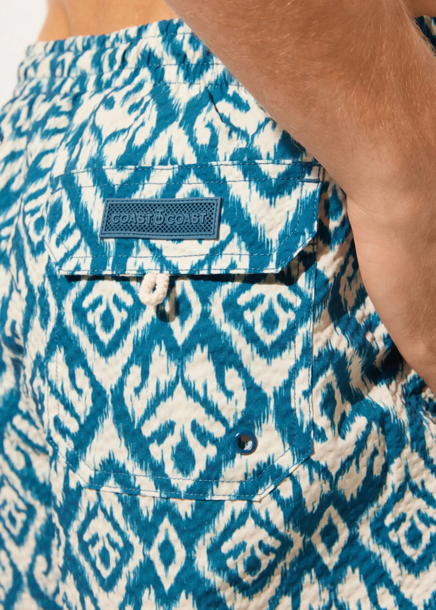 Calções de banho para homem, com elástico coberto na cintura franzida e cordão externo bicolor para ajustar. Corte regular com comprimento acima do joelho, bolsos laterais embutidos e tecido de rede no interior. Bolso traseiro aplicado com aba e fecho de velcro. Tecido seersucker tingido com toque de algodão, que se destaca pelo efeito tridimensional, disponível em diferentes padrões. Forro interior macio e opaco em formato de cueca.